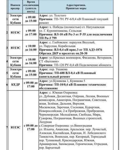 Информация о плановом и срочном отключении электроэнергии и и газоснабжения в Новороссийске 17.10.2025 предоставлена МБУ «Безопасный город».