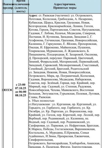 Информация о плановом и срочном отключении электроэнергии в Новороссийске 08.10.2025 предоставлена МБУ «Безопасный город».