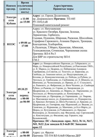 Информация о плановом и срочном отключении электроэнергии в Новороссийске 09.10.2025 предоставлена МБУ «Безопасный город».