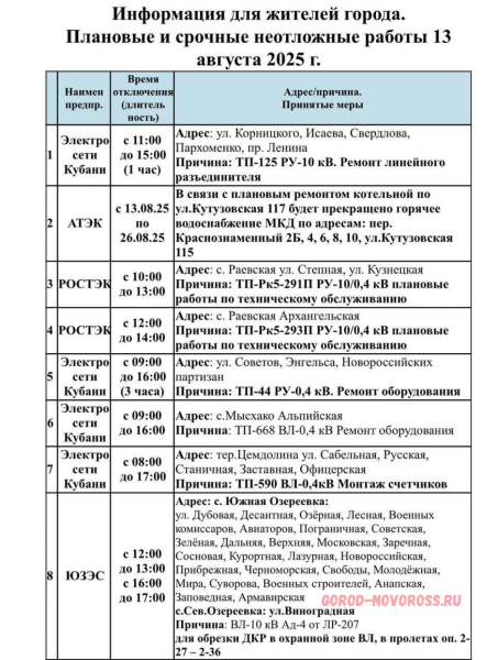 Информация о плановом и срочном отключении электроэнергии и и газоснабжения в Новороссийске 13.08.2025 предоставлена МБУ «Безопасный город». Источник: gorod-novoross.ru