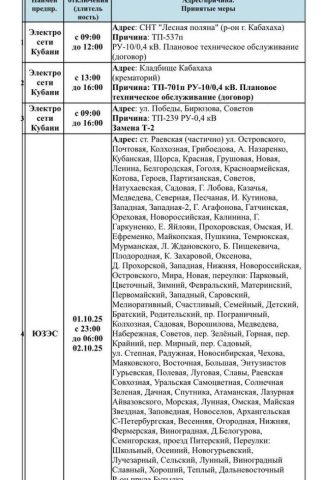 Информация о плановом и срочном отключении электроэнергии и и газоснабжения в Новороссийске 01.10.2025 предоставлена МБУ «Безопасный город».