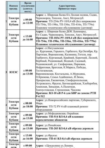 Информация о плановом и срочном отключении электроэнергии и и газоснабжения в Новороссийске 02.10.2025 предоставлена МБУ «Безопасный город».