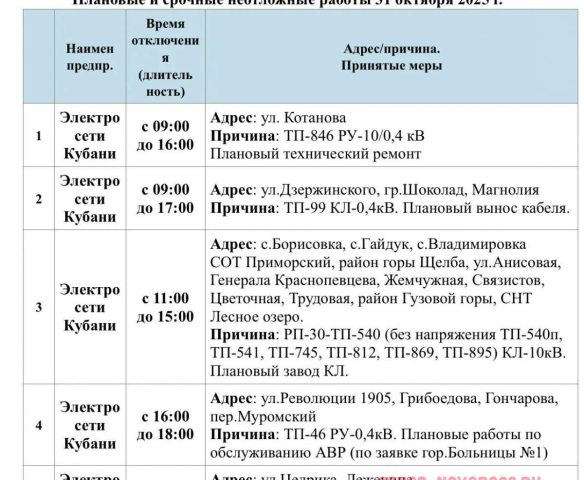 Информация о плановом и срочном отключении электроэнергии в Новороссийске 31.10.2025 предоставлена МБУ «Безопасный город».